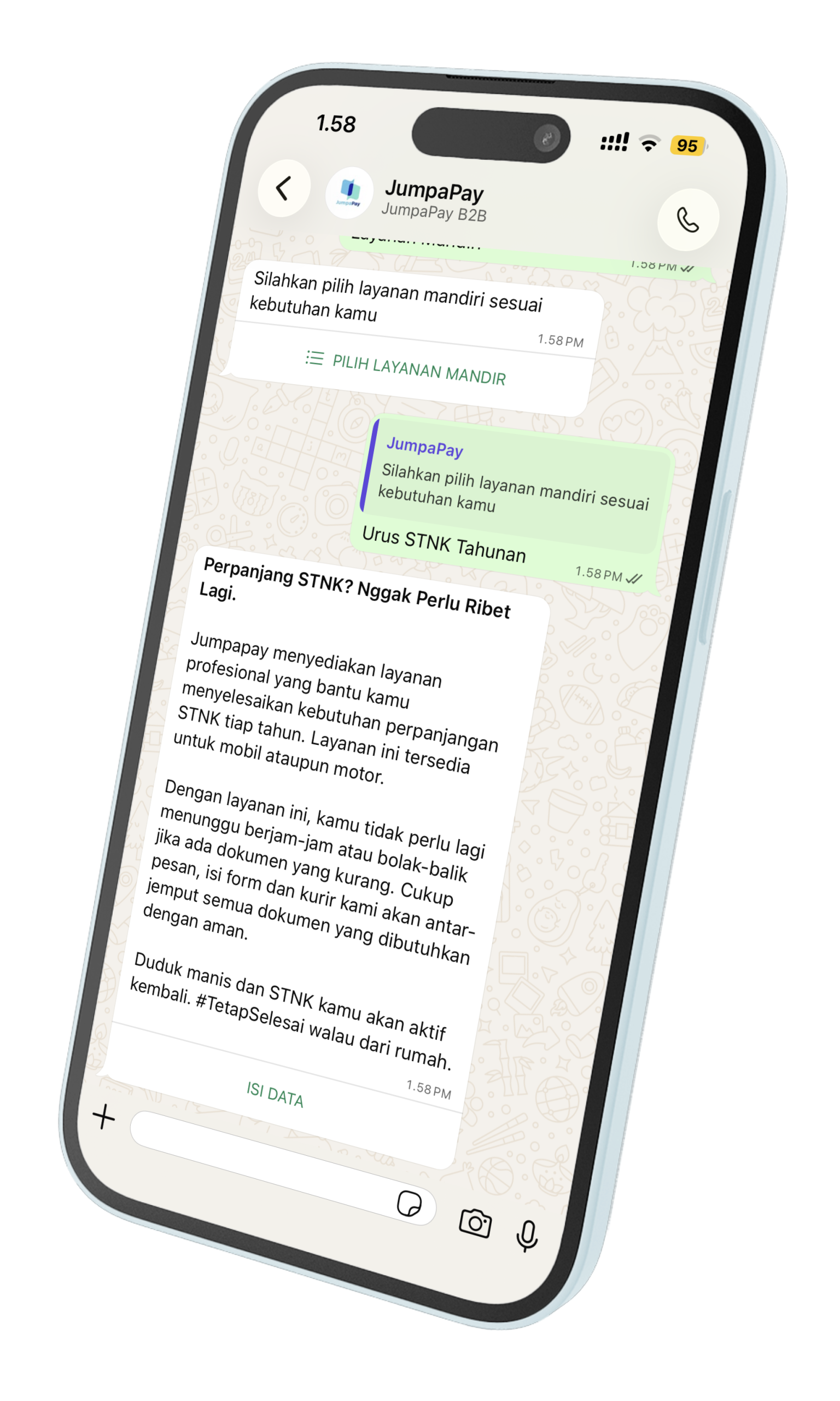 Jangan biarkan kesibukan membuat pajak kendaraan Anda mati. Cukup data via WhatsApp, petugas kami akan mengurusnya ke Samsat. STNK baru Anda akan selesai dalam 1 hari dan diantar kembali dengan aman.
